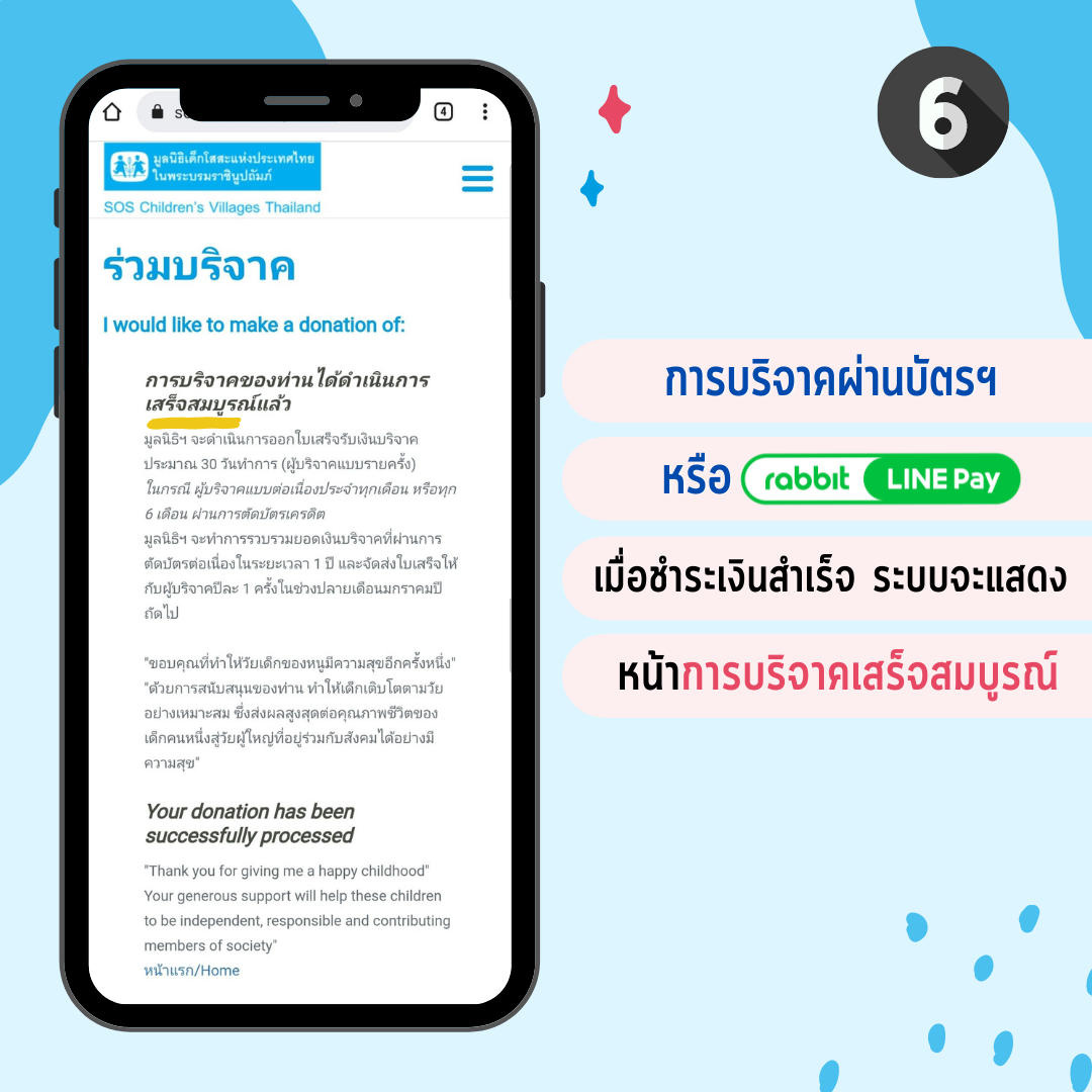 หลังทำรายการชำระเงินผ่านช่องทางบัตรเครดิต/เดบิต หรือ Rabbit LINE Pay เสร็จเรียบร้อย ระบบจะแสดงหน้าการบริจาคเสร็จสมบูรณ์ เพื่อยืนยันการบริจาคเป็นอันเสร็จสิ้น