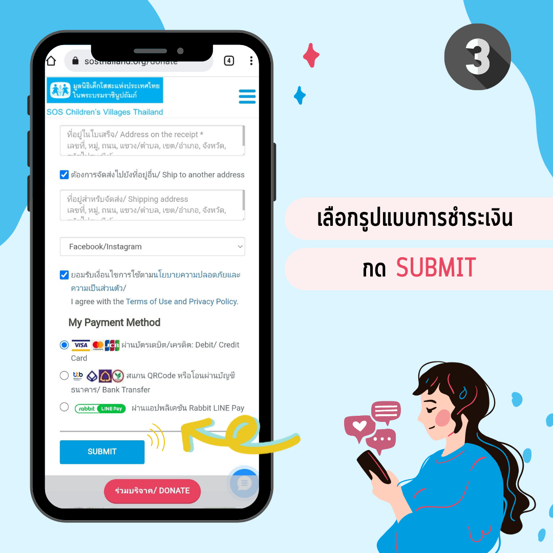 ผ่านช่องทางต่างๆ ได้แก่ บัตรเครดิต/เดบิต, โอนผ่านบัญชีธนาคาร, Rabbit LINE Pay จากนั้นกด SUBMIT
