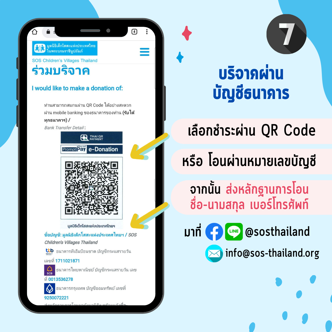 ระบบจะแสดงหน้า QR Code และเลขบัญชีของมูลนิธิฯ ท่านสามารถเลือกสแกน QR Code หรือโอนผ่านเลขบัญชี จากนั้นส่งหลักฐานการโอนพร้อมแจ้งชื่อ-นามสกุล และเบอร์โทรศัพท์ มายังช่องทางต่างๆ ได้แก่ Facebook, LINE หรือ E-mail