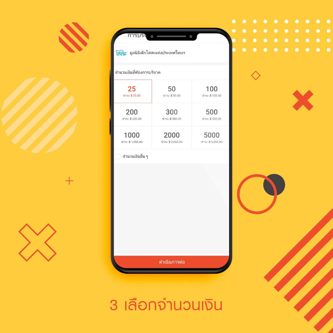 กดเลือกจำนวนเงินที่ต้องการบริจาค หรือเลือก จำนวนอื่นๆ เพื่อใส่จำนวนเงินที่ต้องการ