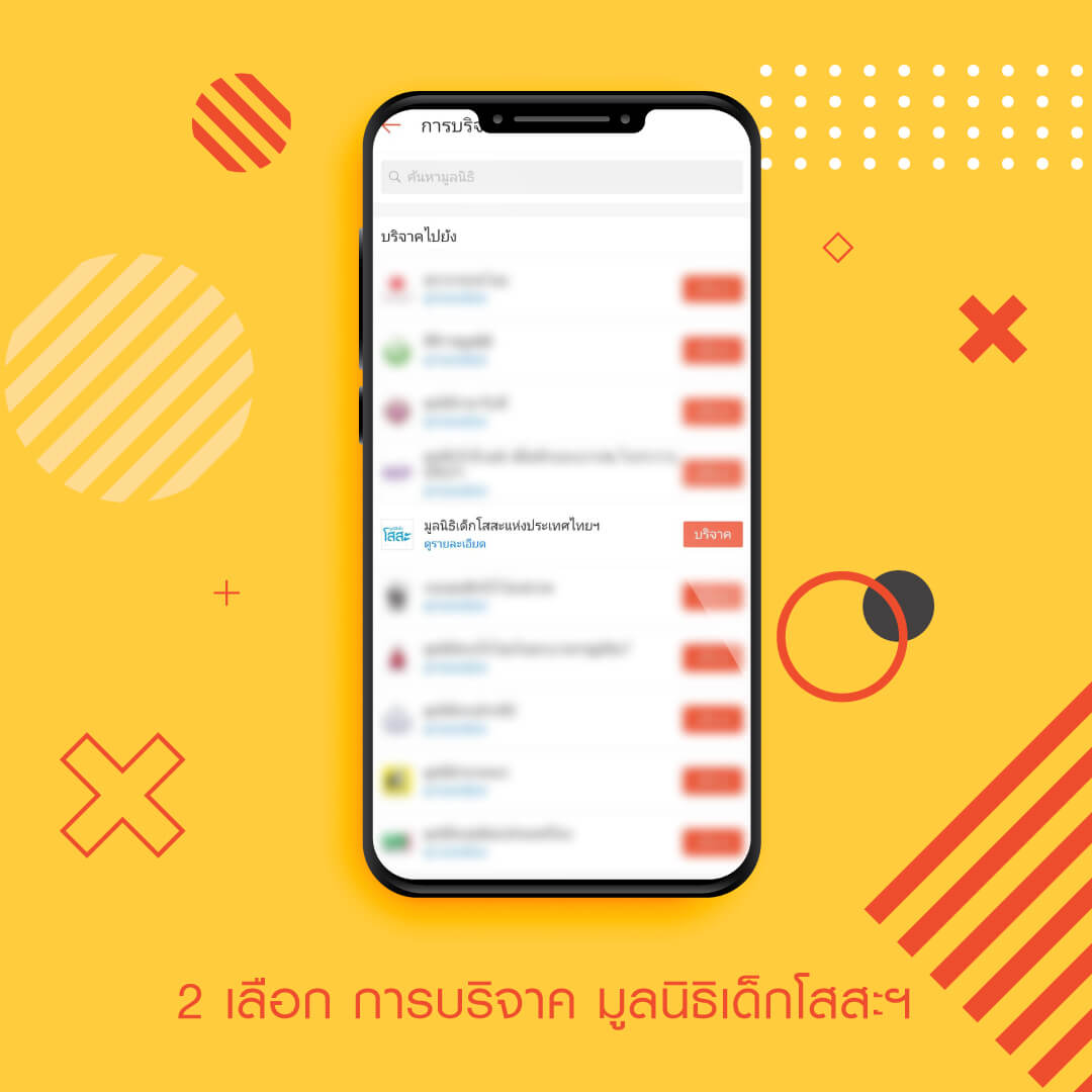 หลังจากกดเข้ามาจะพบกับรายชื่อมูลนิธิต่างๆ ทำการเลือก มูลนิธิเด็กโสสะแห่งประเทศไทยฯ โดยกด บริจาค ที่ด้านหลังชื่อหรือสามารถกดที่ชื่อมูลนิธิฯ เพื่ออ่านรายละเอียดเพิ่มเติมได้