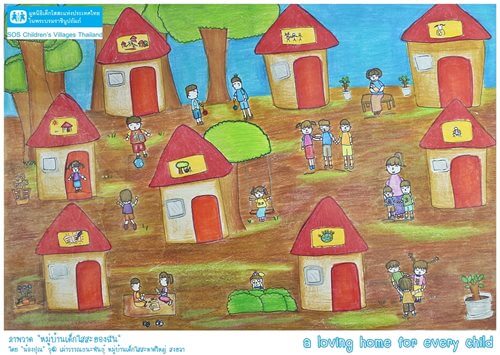 คุณครูให้วาดภาพสถานที่ที่ชอบ พวกหนูก็เลยวาดภาพหมู่บ้านเด็กโสสะค่ะ เพราะพวกเราอยู่ที่นี่ด้วยกัน ทั้งแม่ พี่น้อง และมีเพื่อนๆ ในหมู่บ้าน หนูมีความสุขมากค่ะ